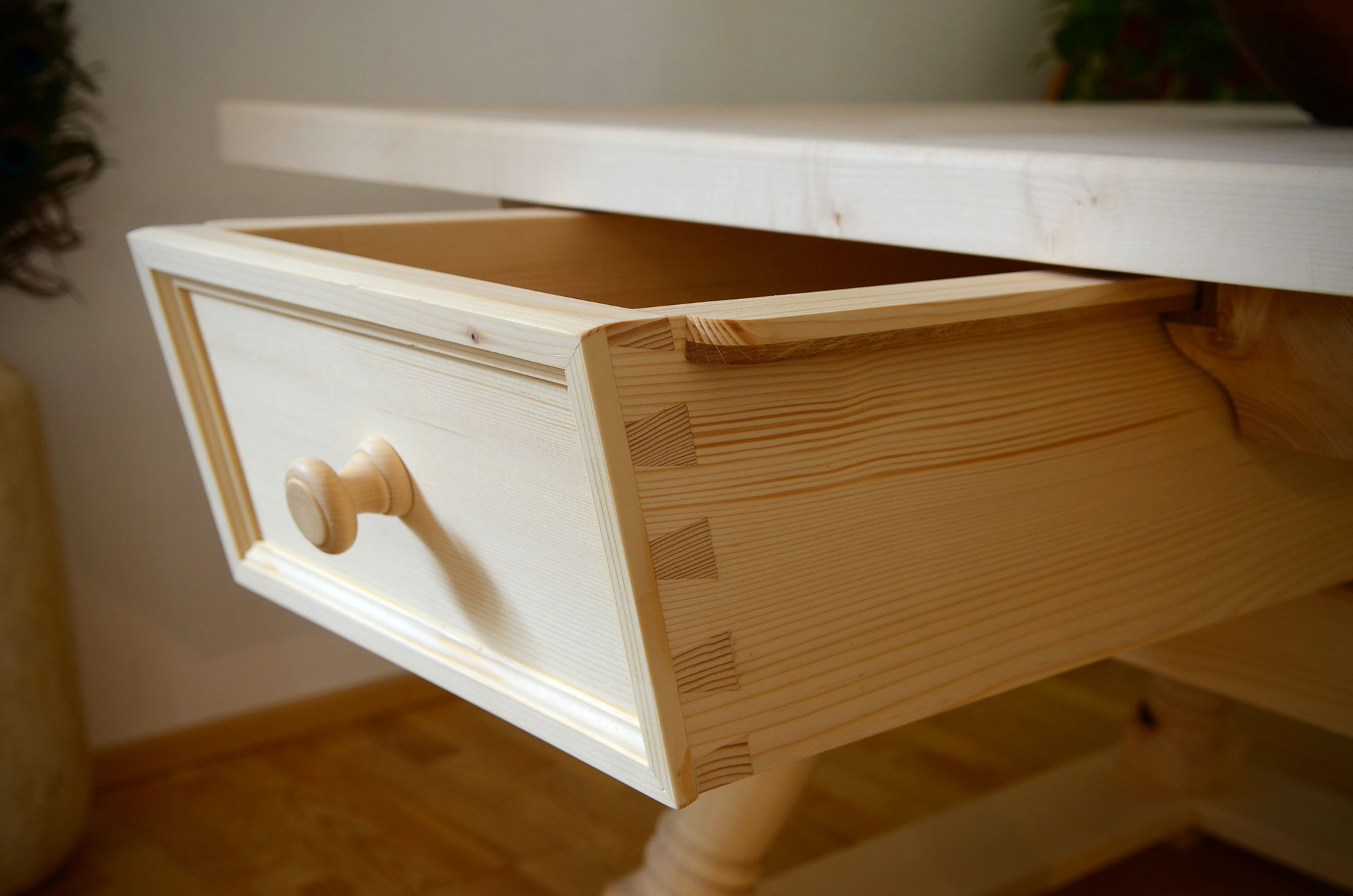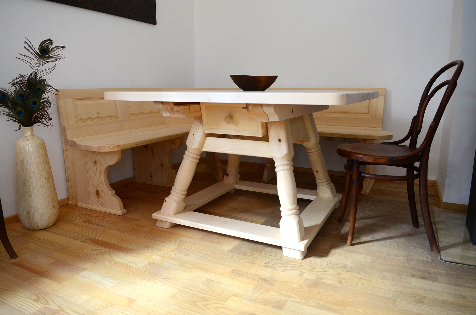 Der Jogltisch mit Bank und Stühlen aus Ahorn und Tanne, Platte gelaugt und geseift, Brotlade, Vergeltsgott, zwei Adler wollte der Falkner, in dessen Stube dieses Stück jetzt steht. Ein Ausflug in die Designwelten des traditionellen, alpenländischen Möbelbaues.