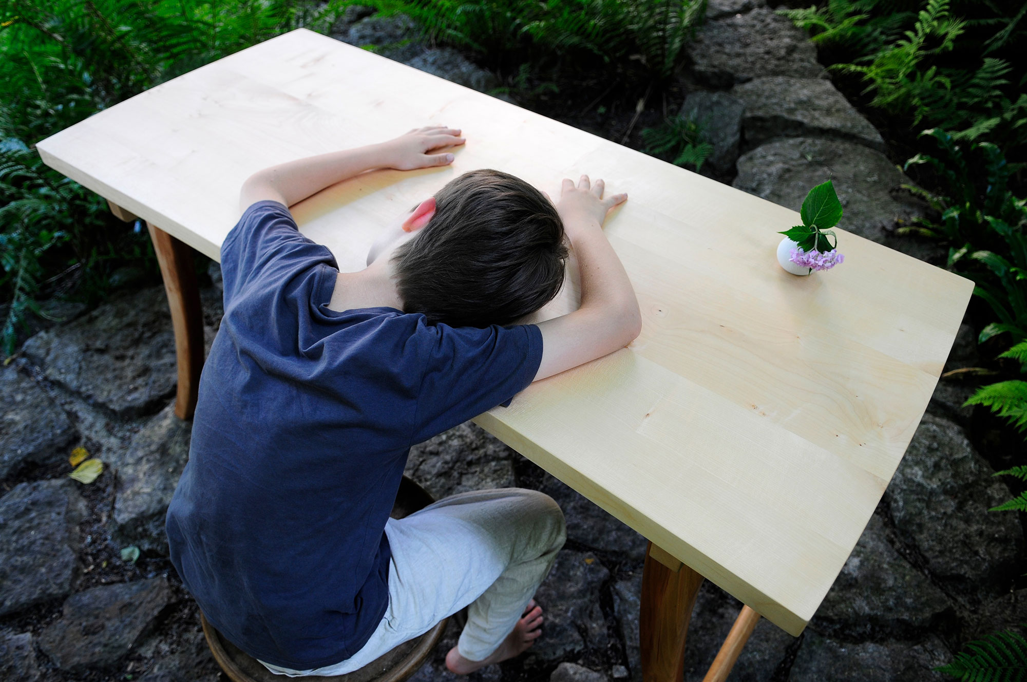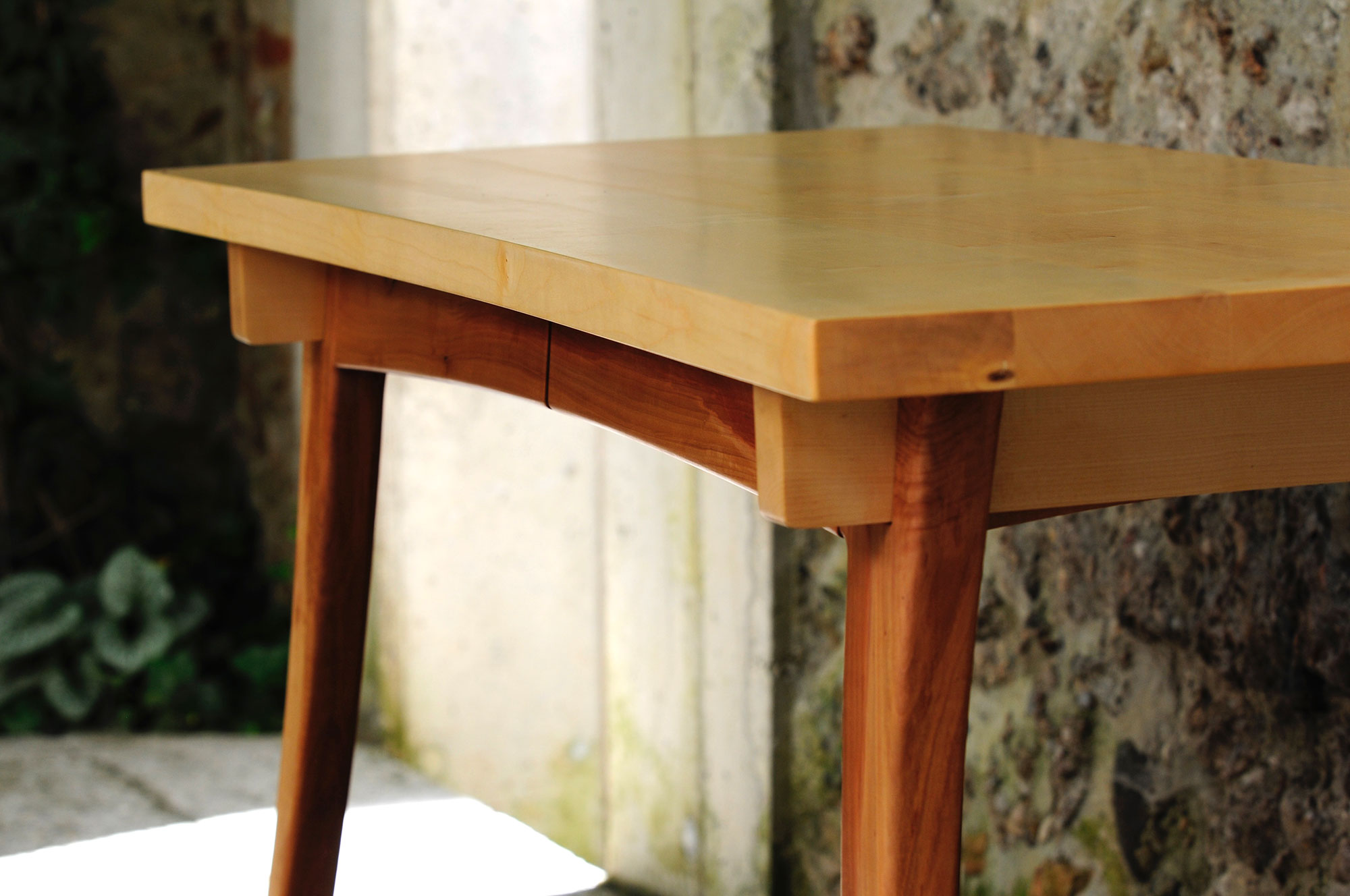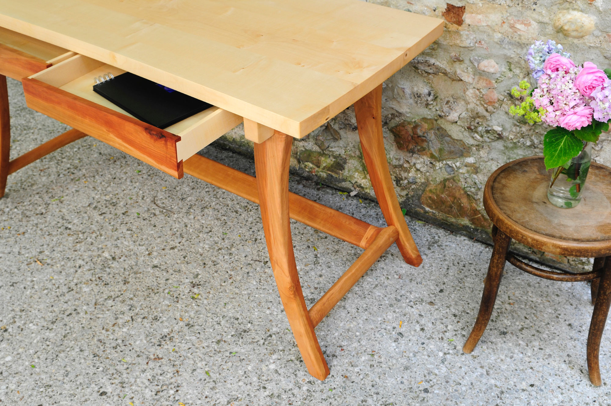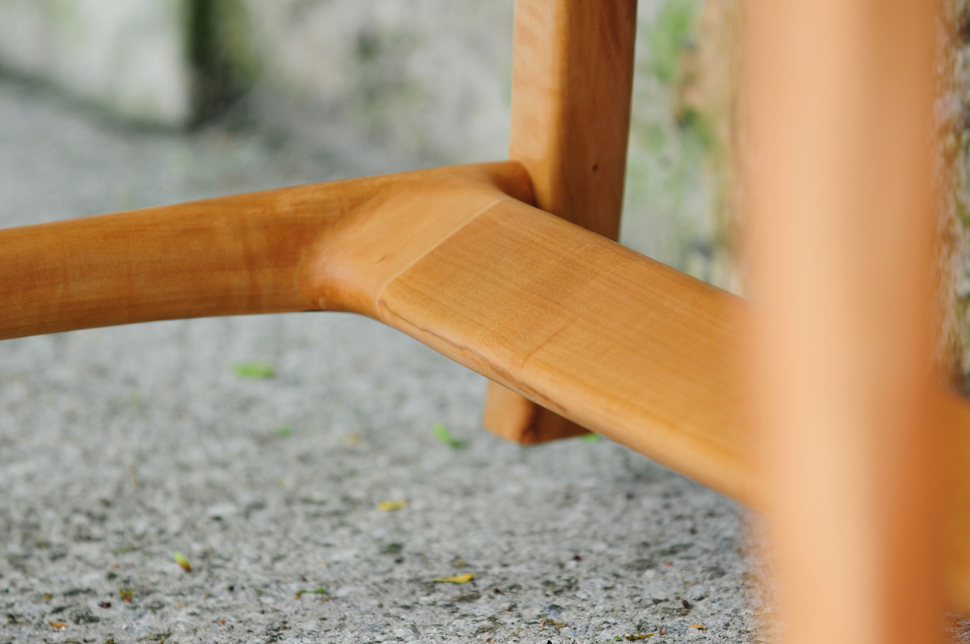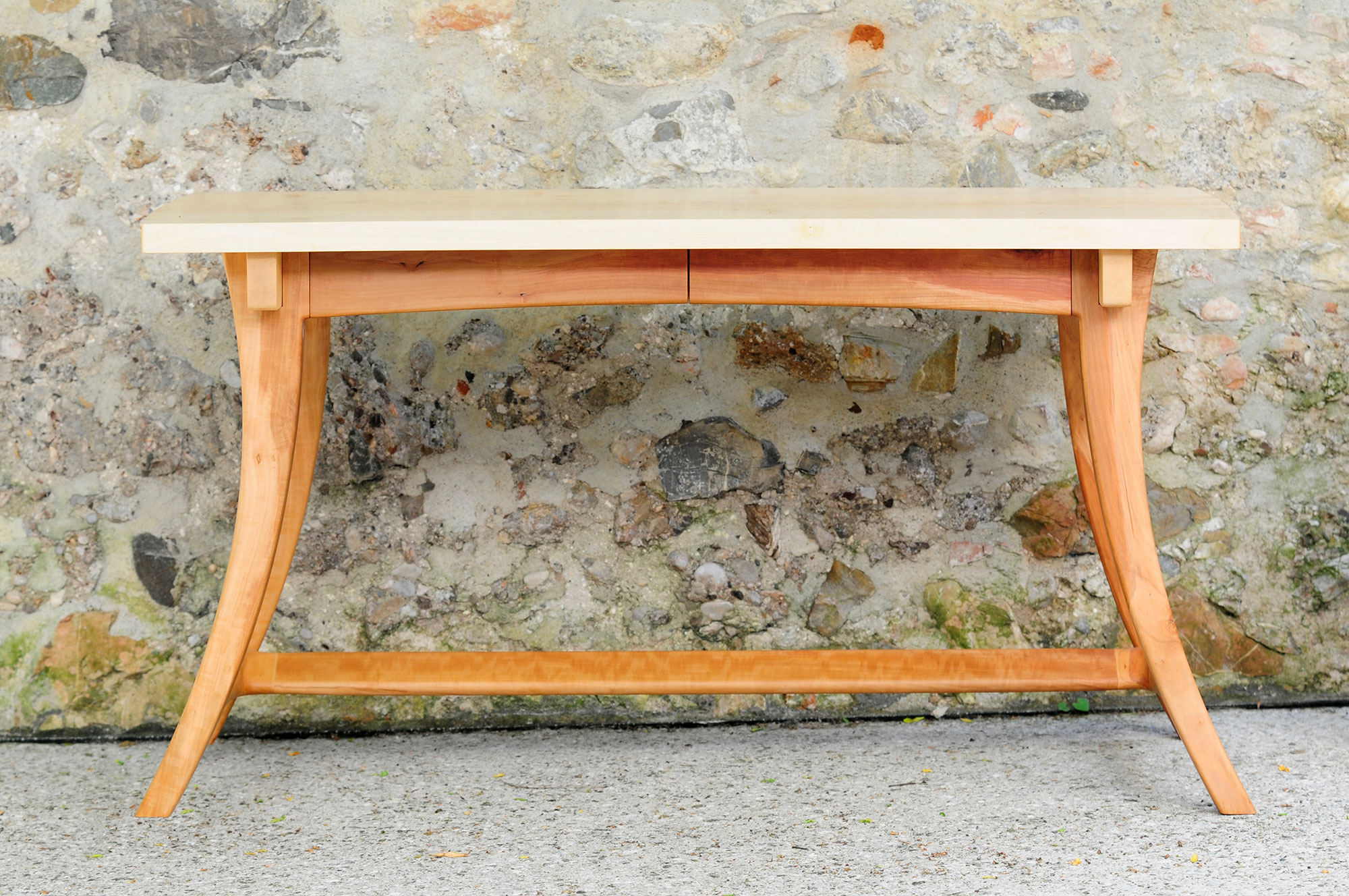 Der Schwung der schlanken Beine war schon im Birnbaum, die Oberfläche streichelt dich, die Platte aus Bergahorn, ein elfenbein-seidenweicher Klassiker, mit Fussschmeichler.